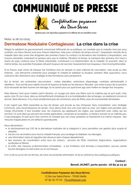 Communiqué de presse - Dermatose Nodulaire Contagieuse: La crise dans la crise