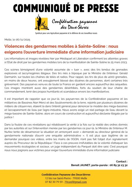 Communiqué de presse - Violences des gendarmes mobiles à Sainte-Soline : nous exigeons l’ouverture immédiate d’une information judiciaire