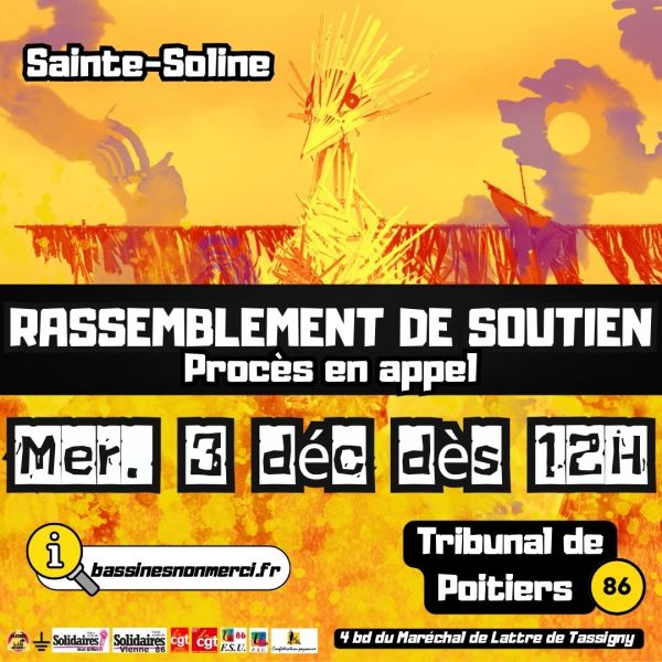 Nous appelons à un large rassemblement à Poitiers, en solidarité aux 4 camarades jugés en appel le 3 décembre. 9 personnes avaient été condamnées en première instance en 2024, dont deux représentants de la Confédération Paysanne (toujours ...