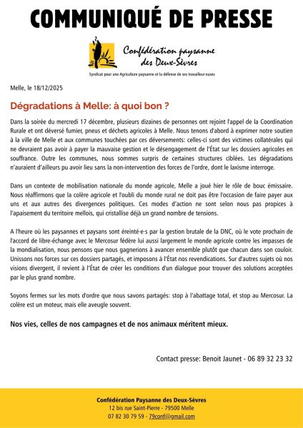 Dégradations à Melle: à quoi bon ? Dans la soirée du mercredi 17 décembre, plusieurs dizaines de personnes ont rejoint l'appel de la Coordination Rurale et ont déversé fumier, pneus et déchets agricoles à Melle. Nous tenons d'abord à exprimer notre soutien à la ville de Melle et aux ...