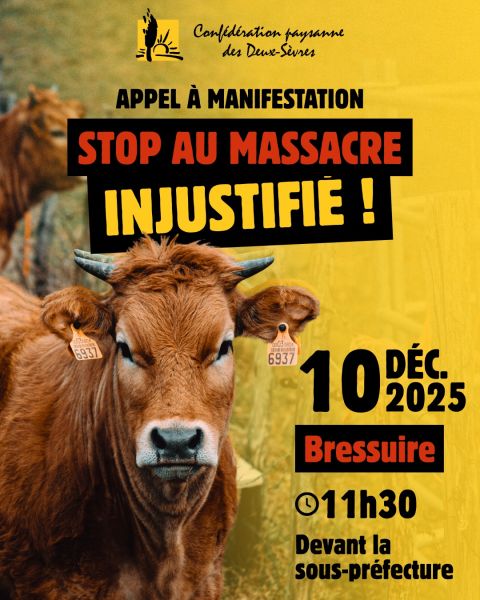 La Confédération Paysanne 79 appelle et invite à un rassemblement devant la sous-préfecture de Bressuire à 11h30 mercredi 10 décembre. Après les images choquantes dans le Doubs (abattage de 82 vaches vaccinées contre la DNC depuis trente jours - pour une seule touchée par la ...