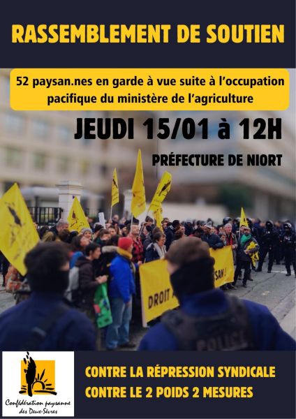 Nous soutenons nos collègues de la Vienne autour d'un de nos camarades paysan, convoqué à payer pour tous les autres pour "vol en réunion" lors d'une opération "caddie gratuit" dans le cadre des grandes manifestations agricoles de janvier 2024 (deux ans déjà !). ...